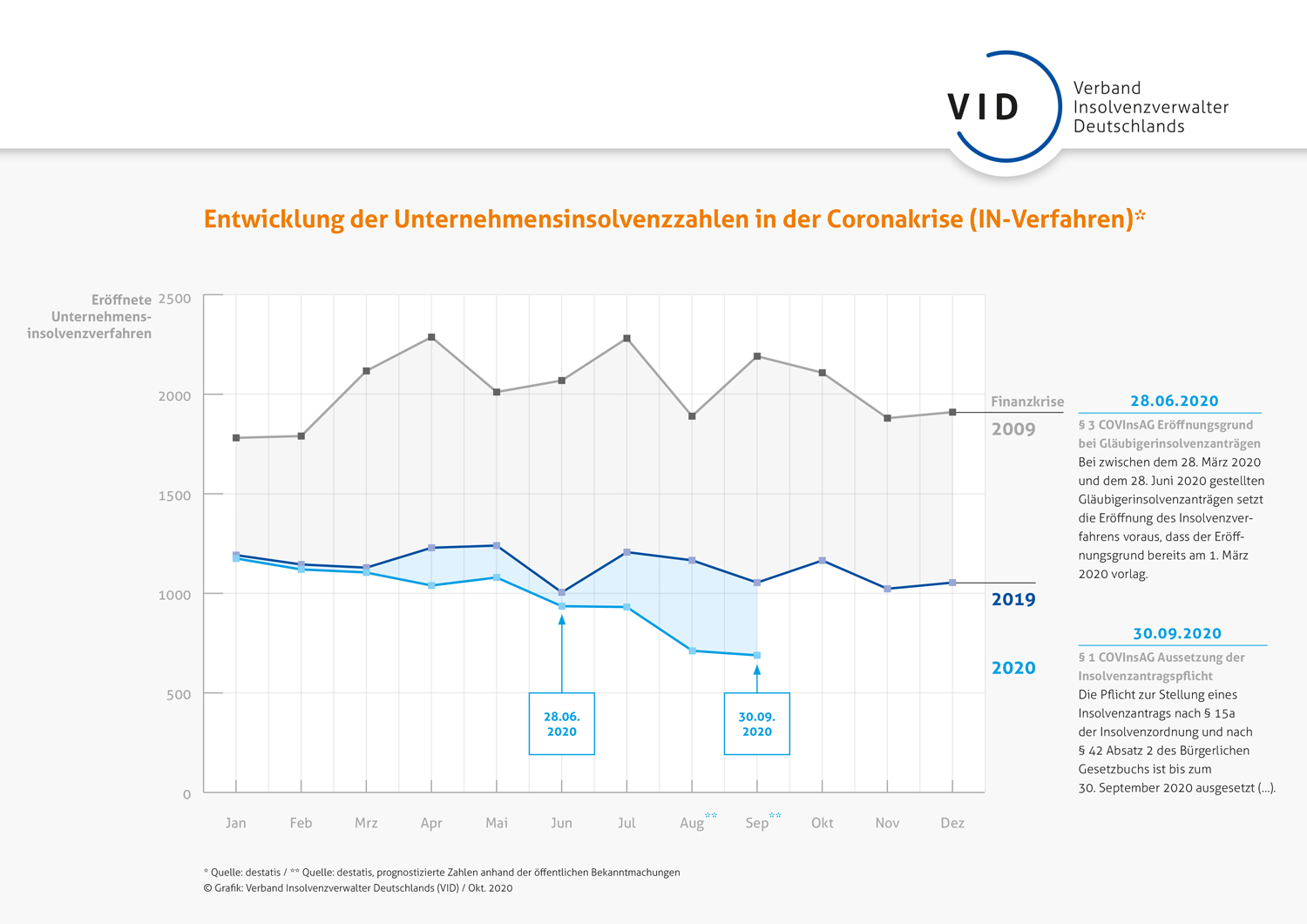 Grafik des VID: Entwicklung der Unternehmensinsolvenzzahlen in der Coronakrise (IN-Verfahren), © Verband Insolvenzverwalter Deutschlands (VID)/Juni 2021, Grafik kostenfrei nutzbar